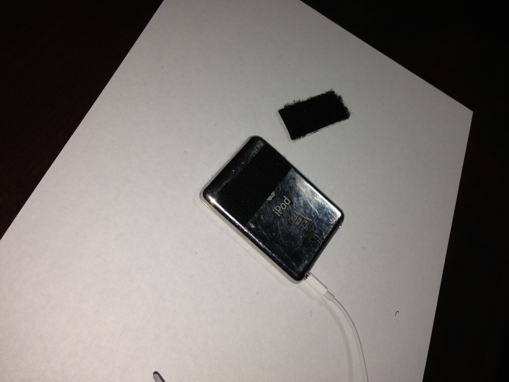 Now I needed a more elegant solution than a rubber band. So I bought some Velcro self-stick material and put one strip on the back of the iPod. A second strip would secure the earbud cords to the first. The Velcro didn’t add enough bulkiness to the iPod for me to notice when it was in my pocket.